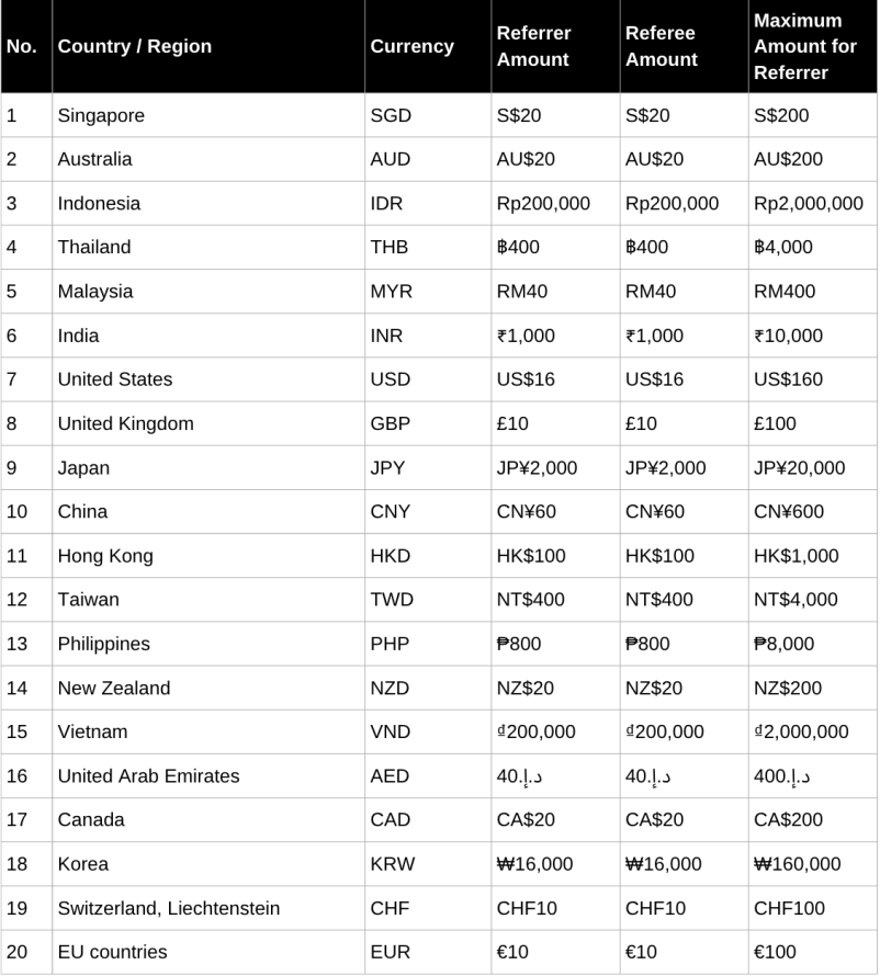 (i) The Referral amount and currency are determined based on the Country of Residence (“COR”) of the Referrer at the time the Referral Link is first shared, as set out in the table below:-